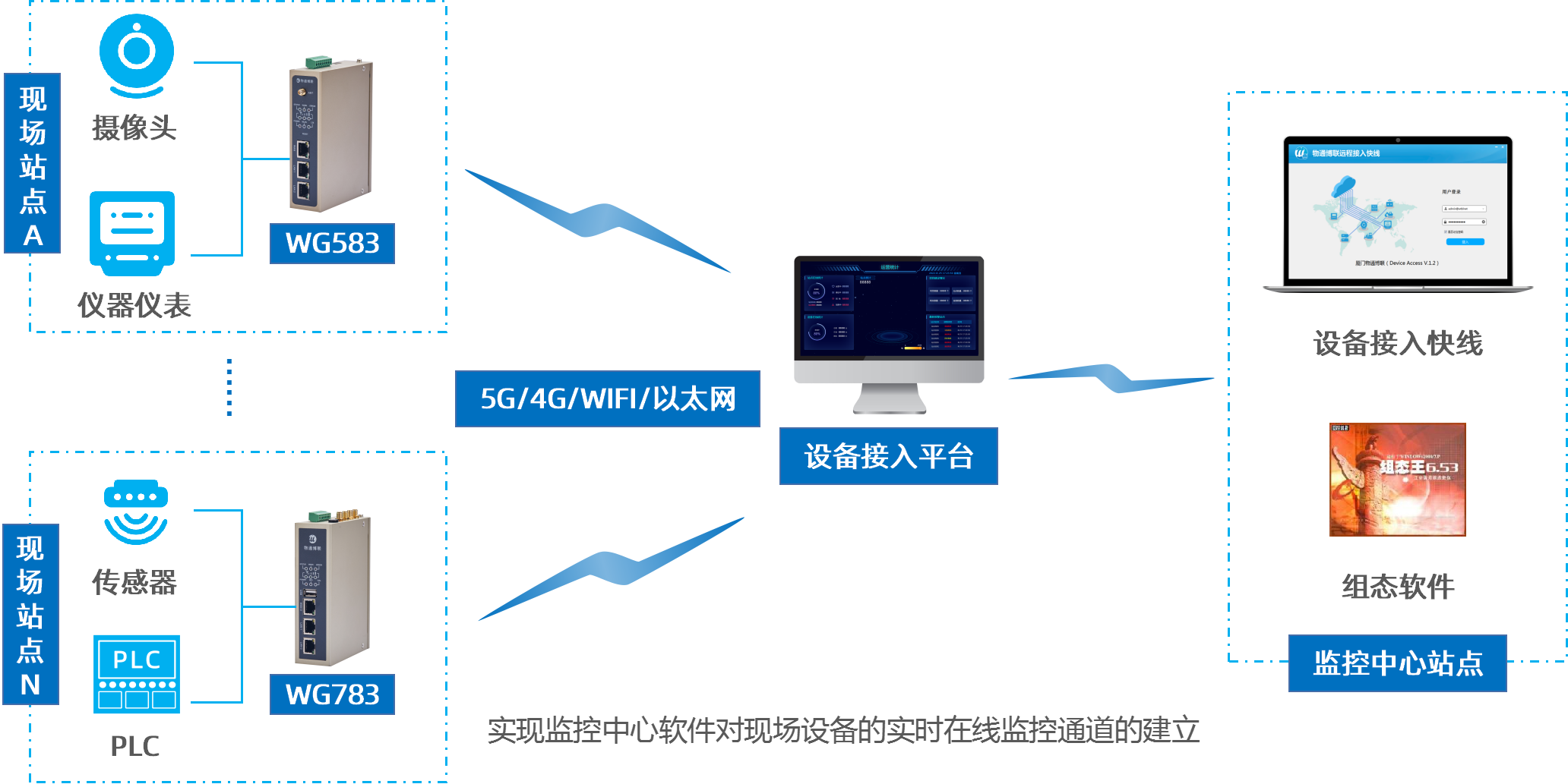 无需自主搭建云应用,无需公网固定IP;只需要购买威九国际网关和开通接入平台账号就可以快速实现多样化设备组网。