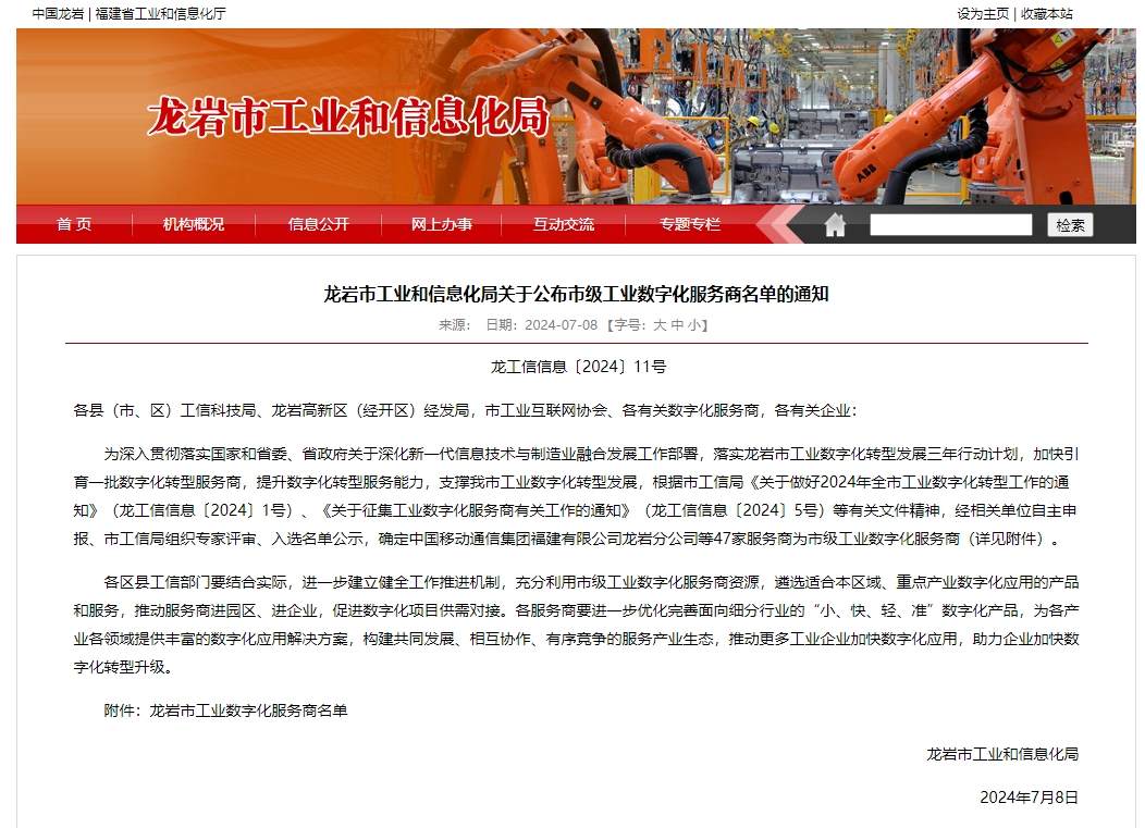 7月8日,龙岩市工信局公布了《龙岩市工业和信息化局关于公布市级工业数字化服务商名单的通知》,厦门威九国际网络科技有限公司成功入选“龙岩市市级工业数字化服务商”。