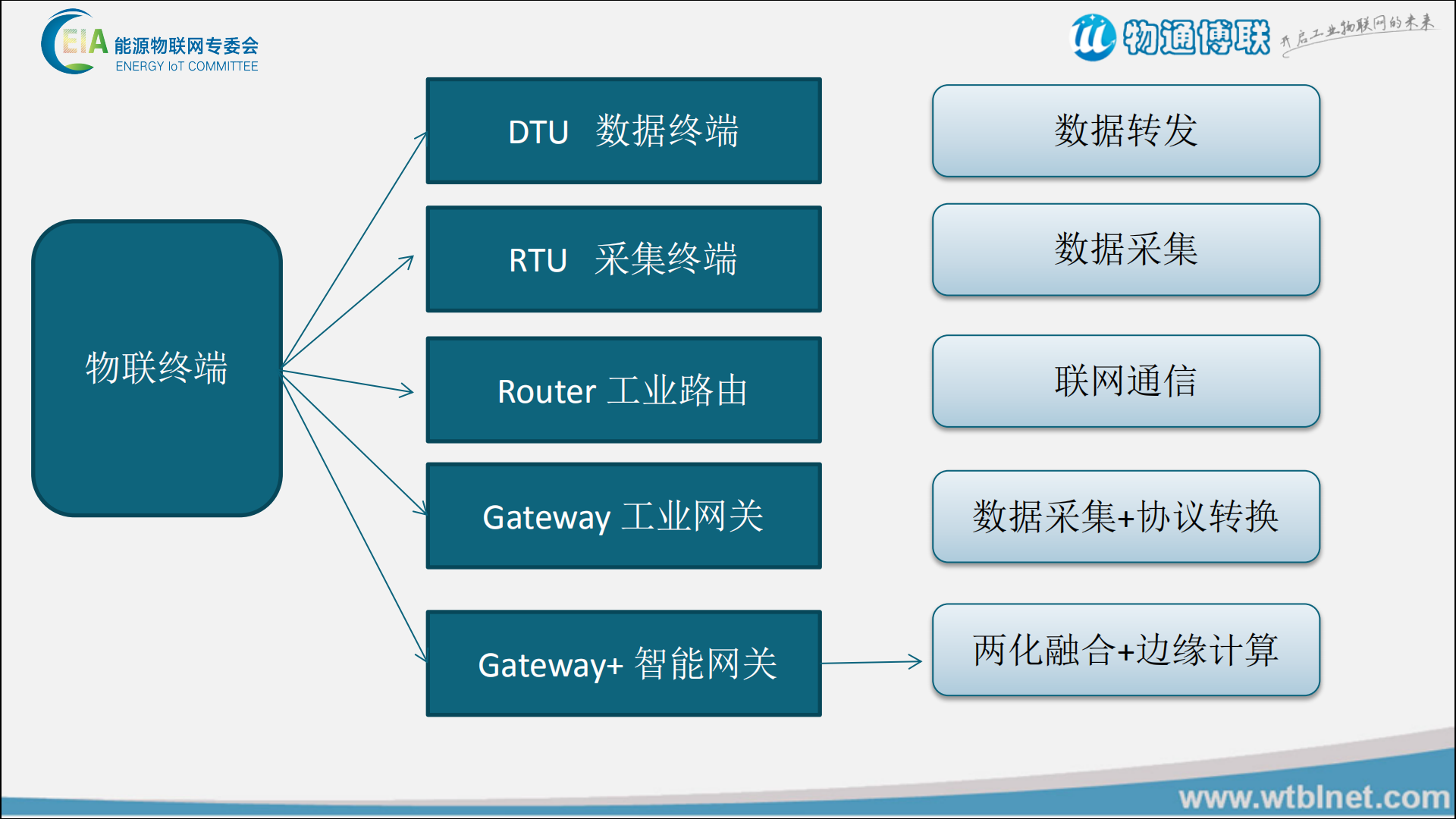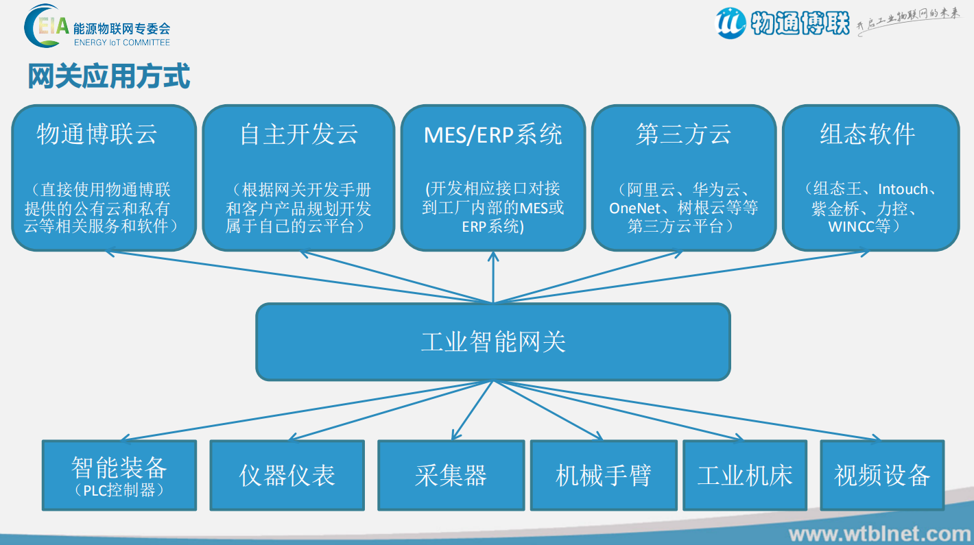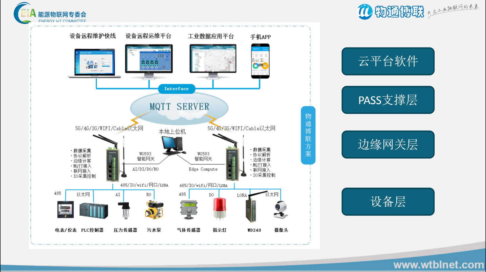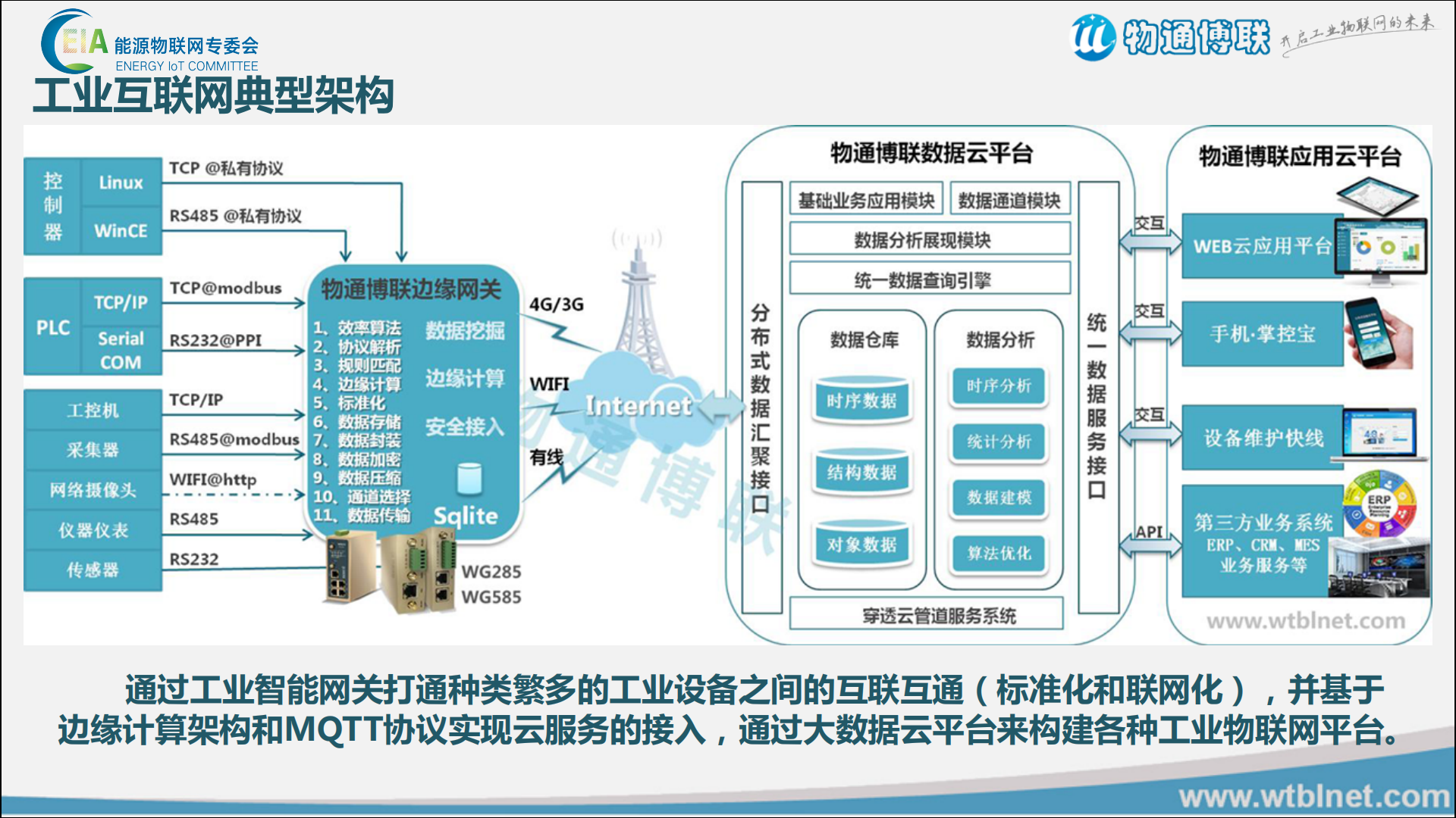 威九国际·受邀国家能源互联网产业及技术创新联盟大讲堂《能源物联网》 时间:2020-09-02 17:22:22 2020年8月28日,威九国际受邀国家能源互联网产业及技术创新联盟(CEIA)、CEIA能源物联网专委会、CEIA能源数字化专委会,做专场《能源互联网的设备联网方案与应用》的演讲。为能源领域的从业者分享关于能源互联网领域的物联网解决方案和物联网产品。 2016年8月,国家能源局批复创建国家能源互联网产业及技术创新联盟(国能科技[2016]222号),由清华大学牵头实行国家能源互联网产业及技术创新联盟的各项组织筹备工作。 威九国际创建于2011年是国内专注于工业4.0应用、工业物联网产品研发的高科技企业,在能源互联网也深耕多年,特别在国家电网、北方供热和智能工厂信息化建设中有丰富的经验和成功案例。 能源互联网是新能源技术跟信息技术的深入结合为特征而催生的一种新的能源利用体系,它将能源生产,能源消费有机结合在一起。其中物联是基础,采用先进的传感器、智能的工业网关、智慧化的控制和软件系统,将能源生产端、能源消费端数以亿计的设备、机器和系统连接起来,形成整套系统;顺利获得大数据、机器学习和预测给予能源效率和用能的利用率。 本次威九国际演讲主要从能源物联网的需求分析、系统架构、物联产品和应用案例四个方面进行介绍分享。 能源是工业血液,伴随工业4.0技术的应用,能源互联网也是重要组成部分。 典型的工业互联网架构(现场设备+工业网关+PASS平台+SAAS平台) 边缘计算和云端计算协同,顺利获得智能化的网关实现数据采集,顺利获得智慧化的平台实现分析 供热系统的组成(热源厂+换热站+热用户) 电网的组成(发电+变电+配电+用电) 物联网无线技术演进(1G+2G+3G+4G+5G) 物联网终端分类(Dtu->Rtu->Router->Gateway->Gatway+) 网关对接云平台功能(威九国际云平台+自主开发云平台、MES平台、阿里平台、组态王) 威九国际·物联网终端的介绍: 工业云网关(各种设备数据采集、4G/WIFI/以太网/5G /LORA联网,各种云平台接入) 边缘计算网关(边缘计算、PLC数采、电表数集、水表数采、电力设备数采、IO采集) 威九国际是一家工业智能化产品及应用服务给予商,专注于为设备制造商、智能工厂及行业项目等领域给予智能网关、设备快线及应用云平台产品及方案。凭借在两化融合、设备联网、边缘计算、大数据分析及工业建模等核心技术的积淀和优势,威九国际作为工业4.0的先行者,产品得到国内外顶级客户和广大中小企业的青睐,为客户给予整体智能化解决方案,协助客户实现数字化运营管理和工业互联网新价值挖掘。 附: 【CEIA能源互联网大讲堂】第37期 回放视频 演讲主题:能源互联网的设备物联网方案及应用 演讲嘉宾:厦门威九国际网络科技有限公司 刘明德 视频链接:http://v.qq.com/x/page/a3145t8271l.html 内容大纲: 1、能源互联网的需求分析 2、能源互联网的系统架构 3、能源互联网的产品介绍 4、能源互联网的应用分享 上一篇:威九国际作为工业互联网先行者,受邀参加2020数字中国峰会及《工业互联网论坛》 下一篇: 威九国际在厦门两岸股权交易中心 “闽西南科技板”成功挂牌 相关推荐 数据驱动,智造未来丨万晖五金设备数采项目启动会圆满举行 2025-09-19 向新求质|威九国际获评2024开展新质生产力“影响力企业”,总经理刘明德获评2024开展新质生产力“领军人物” 2025-04-25 邀请函丨威九国际邀您相约福州国际数字产品博览会 2025-04-17 新起点,新征程|威九国际乔迁盛典圆满举行,开启未来新篇章! 2025-04-17 相关产品 工业智能网关 威九国际·WG系列工业智能网关是一款支持采集各种PLC,仪器仪表,水环保,电力设备,CNC等各种工业设备数据,具有协议解析,边缘计算的高可靠性工业智能网关,是构... 工业数采终端 威九国际·WD系列工业数采终端,主要实现对现场工业设备的数字量DI、DO,模拟量AI,AO的采集和控制,实现LORA本地组网和4G数据上云的功能,从而实现对现场... 工业无线路由 威九国际·工业联系终端包含WR系列工业无线路由、WC系列网段隔离器和WS系列工业交换机。 支持5G/4G/WIFI/以太网等方式联网接入,支持VPN组网,为现... 设备数据平台 威九国际·工业设备数据平台是一款高并发的工业设备远程管理和工业设备数据可视化的云平台,广泛应用于智能工厂数采中台、远程设备运营管理平台、各行业的物联网数据云平台... 设备维护平台 威九国际·设备远程维护系统是一套实现对分散式设备远程维护和运营的软硬件系统,为工程师搭建一条通往远端设备现场的安全数据通道,实现对现场设备(PLC)的远程配置、... 设备接入平台 威九国际·设备远程接入云平台是一款针对分布式设备数据实时监测的快速接入平台,采用SAAS云服务方式为工业现场的各种工业设备的数据互通互联建立实时在线的数据通道。 整体解决方案 威九国际专注于为设备制造商、智能工厂及行业项目等领域给予工业智能网关、工业数采终端、设备远程维护管理系统及工业设备数据云平台等产品及方案,协助客户实现数字化运营管理和工业互联网新价值挖掘。