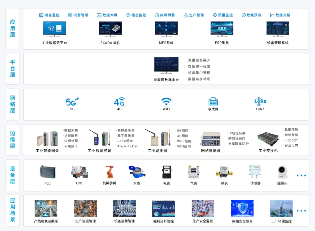 顺利获得工业智能网关、数采终端、工业边缘计算机等硬件,在 5G 网络支撑下,实现 PLC、数控机床、机械手臂、注塑机、水电气热表、能源设备、安防、 环保监控设备等全品类设备一站式接入。依托边缘预处理能力,解决工业协议不统一、数据格式杂乱的核心痛点,为数据价值挖掘奠定基础。