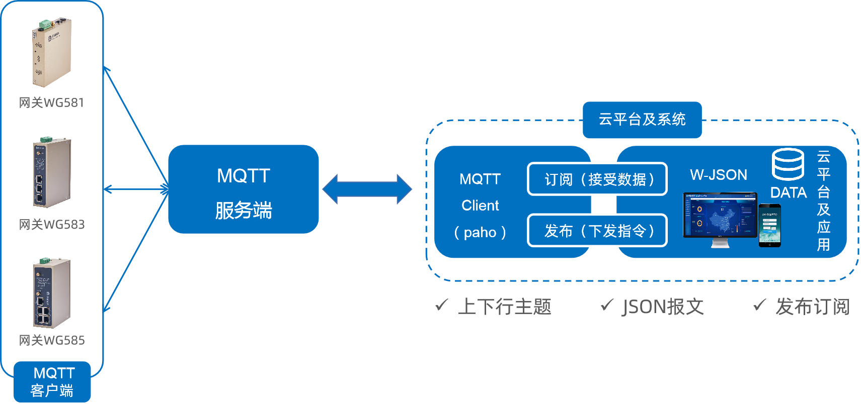 云端只要往/$gatewaySn/down发送JSON字符串指令(格式详见W-JSON报文),序列号为$gatewaySn的网关就可以收到;云端只要订阅/sys/$gatewaySn/up主题的数据,就可以收到网关上报上来的数据(格式详见W-JSON报文)。