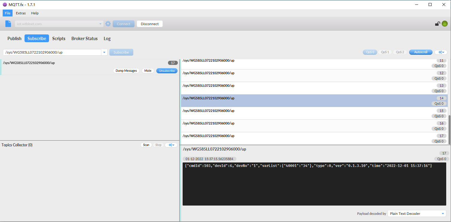 威九国际网关的上行主题为/sys/$gatewaySn/up,下行主题为/$gatewaySn/down。