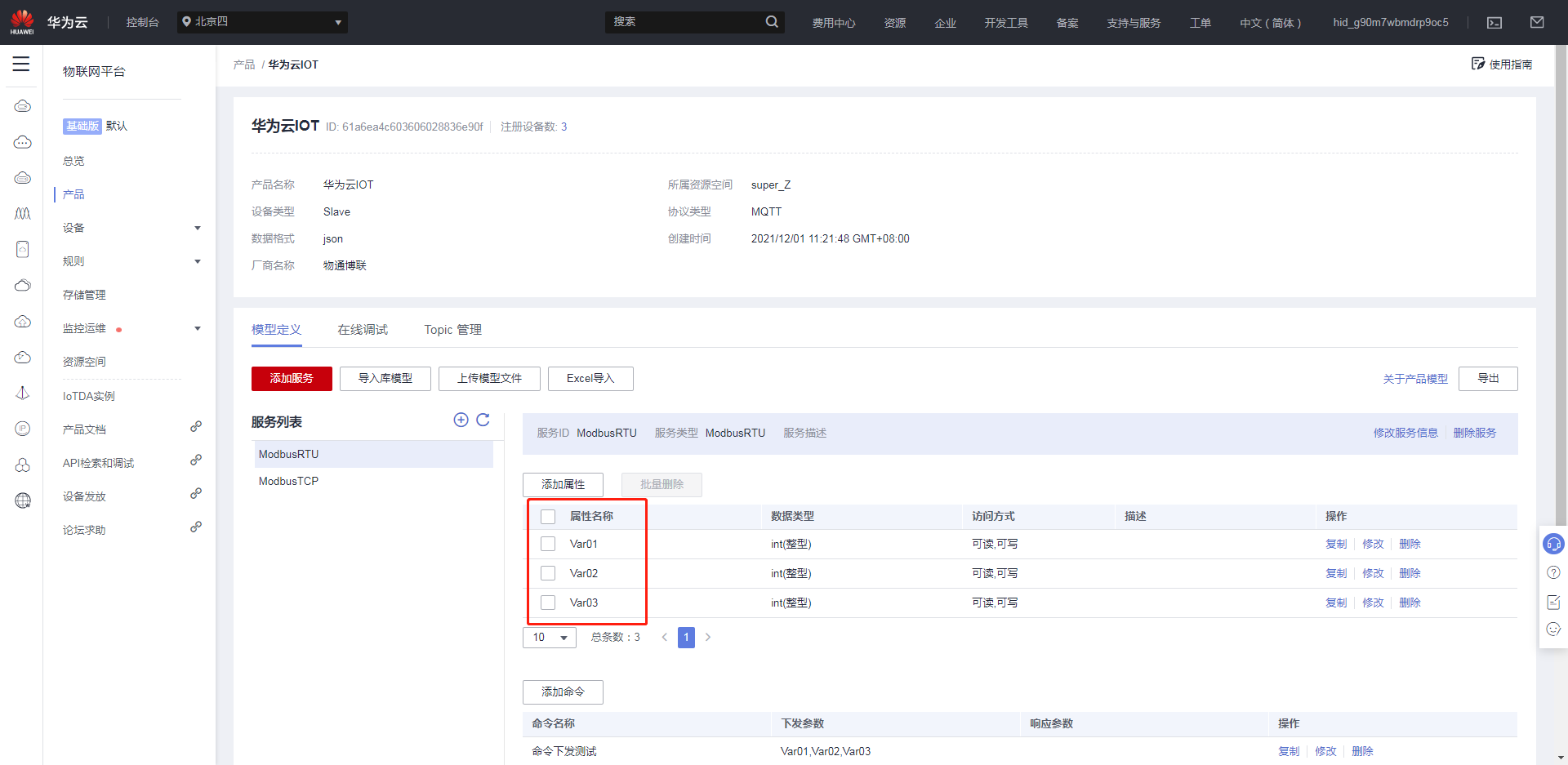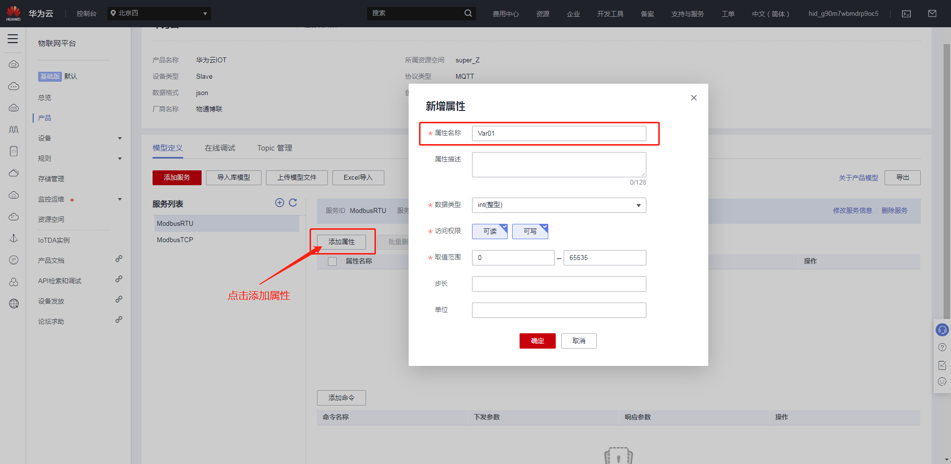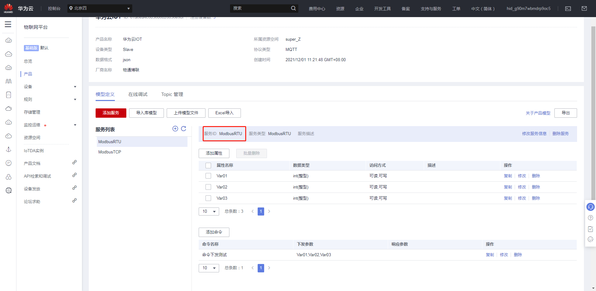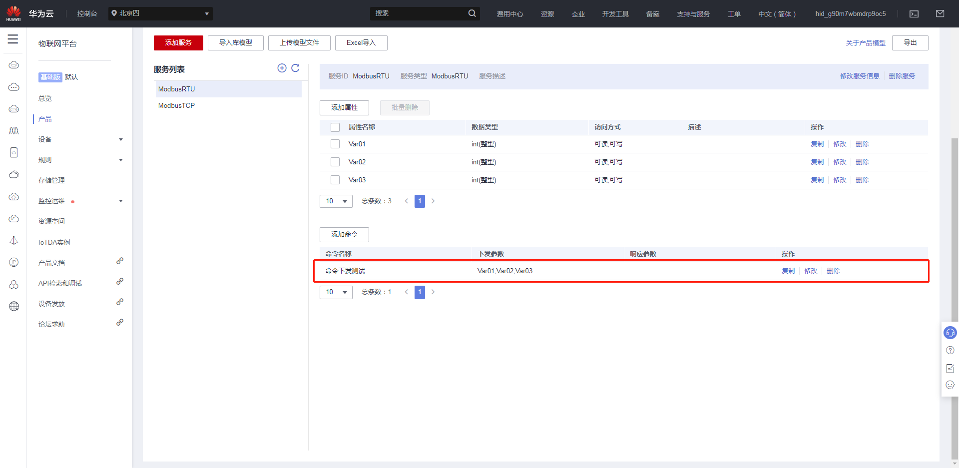 创建完产品后,点击创建好的产品,进入自定义模型界面,点击自定义模型,创建服务ID。