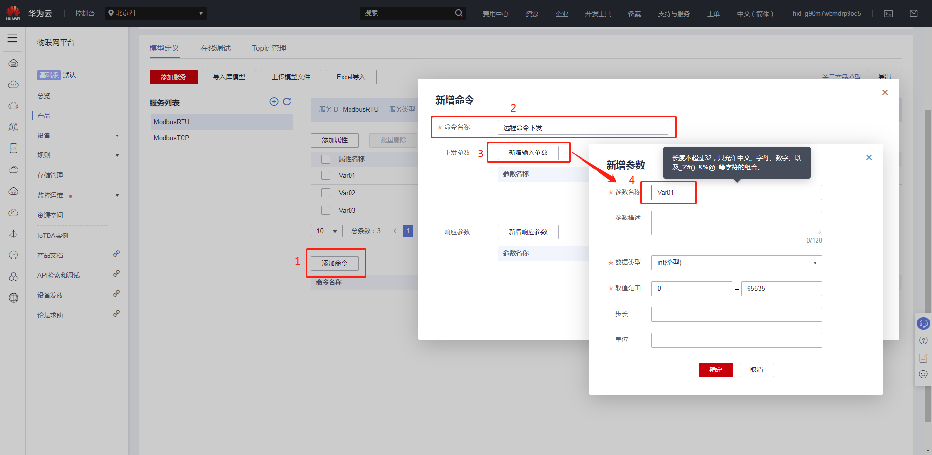 华为云反控设定:点击添加命令,定义命令名称,新增输入参数,建立需要下发写的参数,“参数名称”要与需要下发写的“属性名称”对应