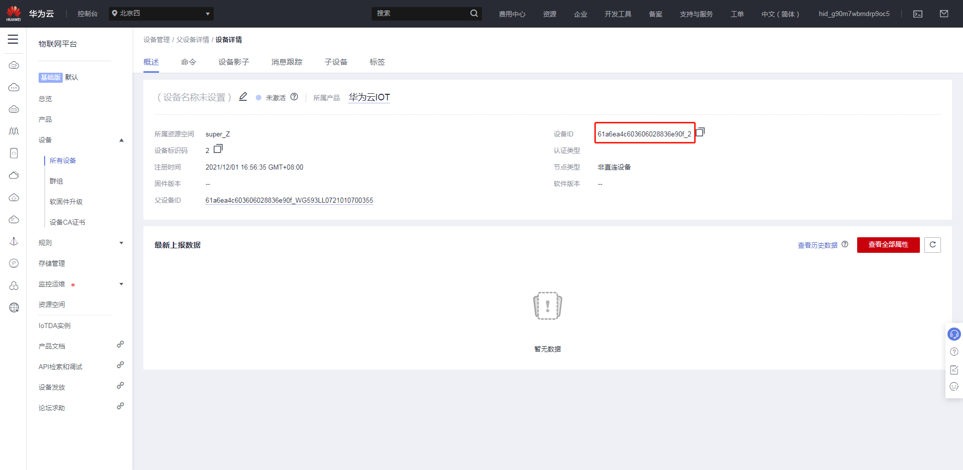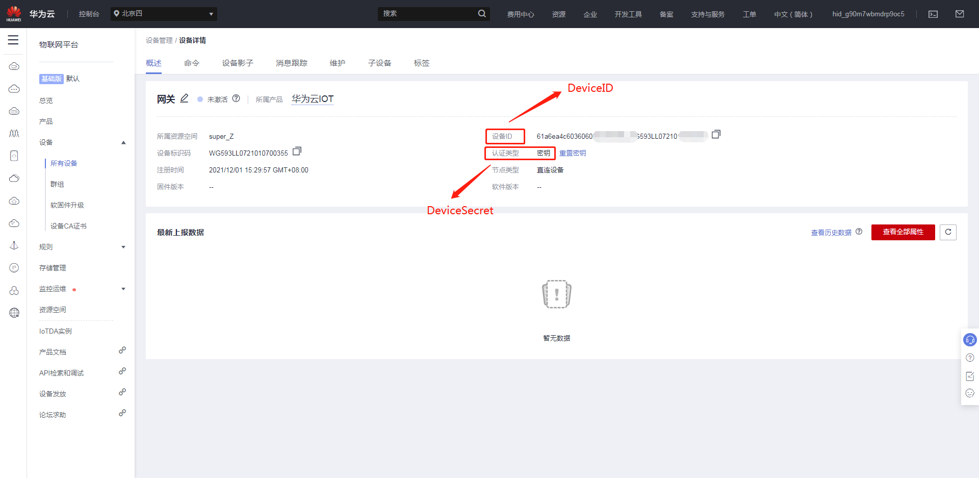 • DeviceID为之前在华为云IOT所有设备上注册的设备生成的设备ID;