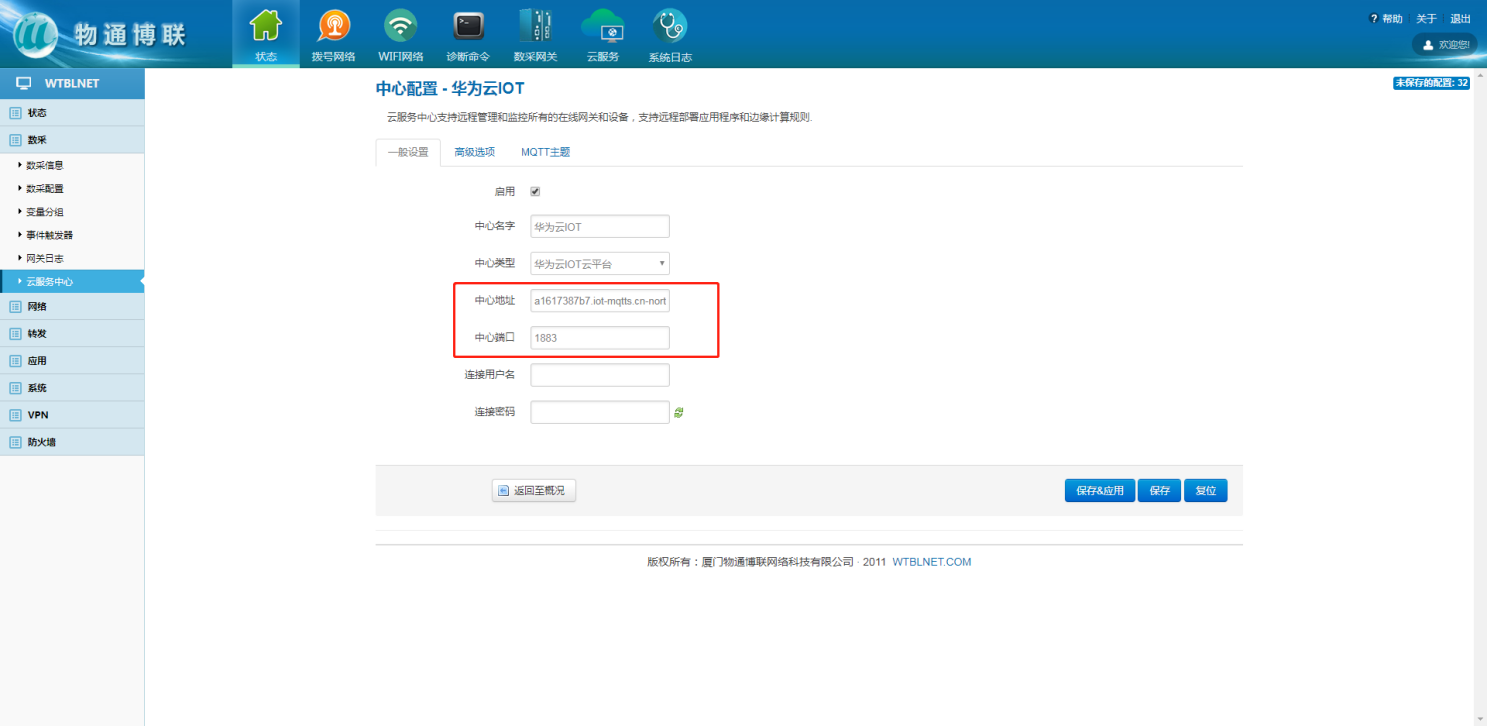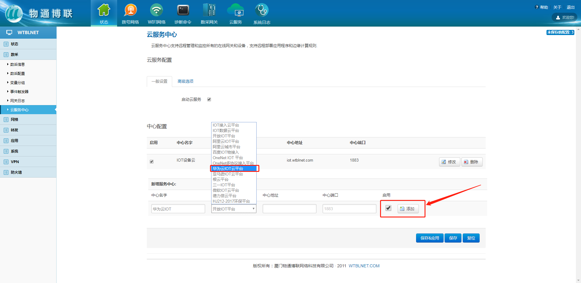 在网关本地web界面内,左侧目录栏中选择数采,下拉框中的云服务中心来配置网关与华为云IOT的MQTT连接参数,中心类型选择华为云IOT平台,并勾选启用,点击添加。