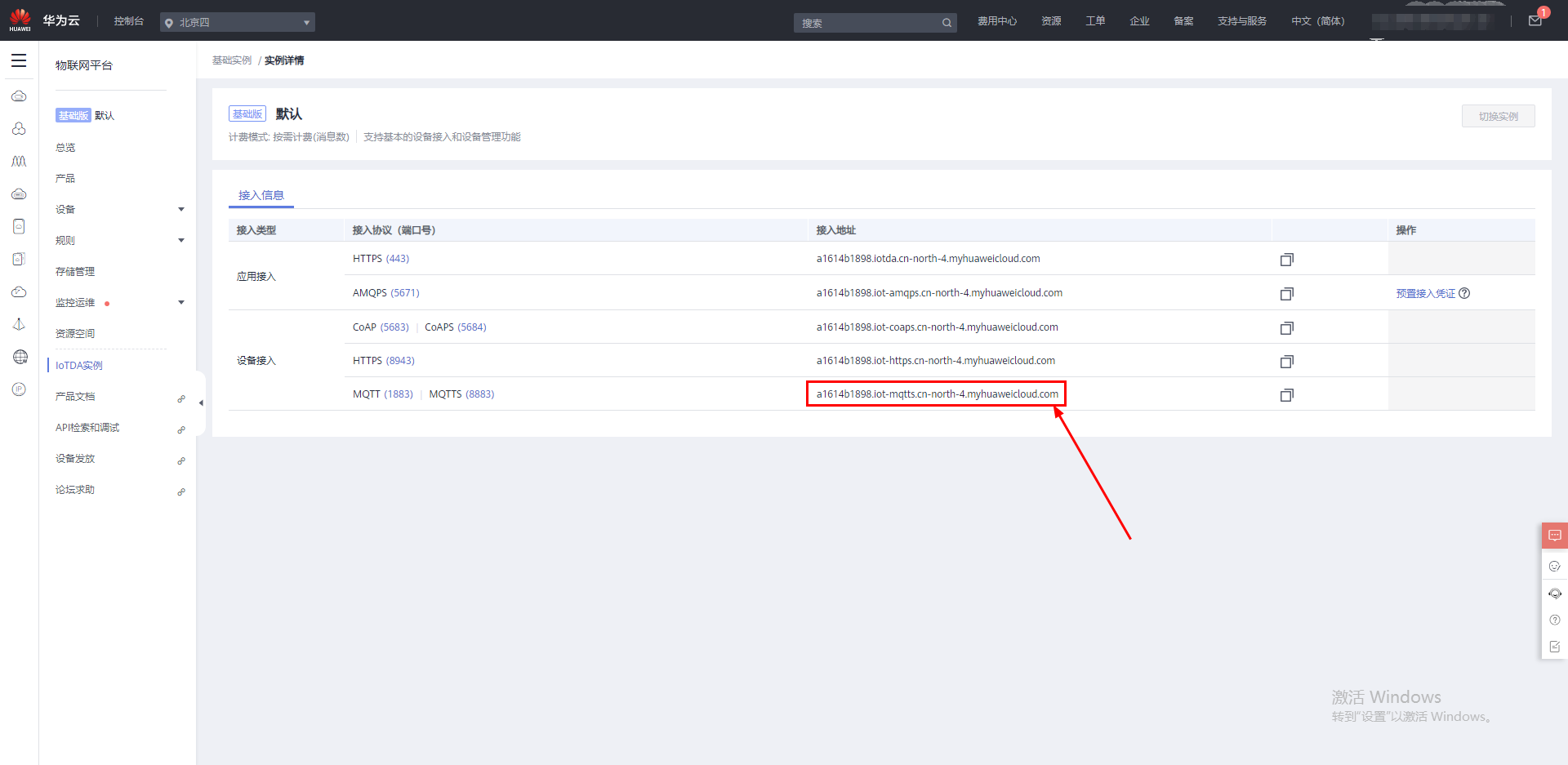 云中心地址在华为云IOT,左侧目录栏总览上的平台接入地址内,点击进入,相关MQTT连接的中心地址以及端口号复制到网关上。