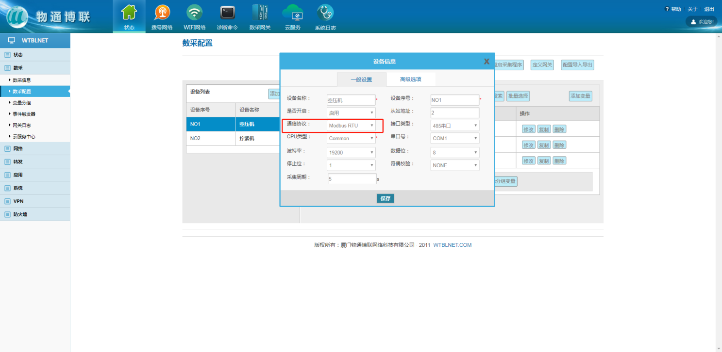在数采配置中添加设备信息,选择对应采集设备的协议及通讯参数;