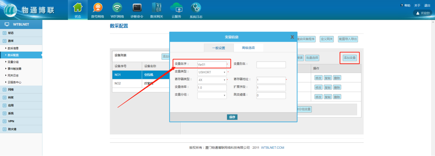 添加变量名称,网关端“变量名称”与华为云IOT的“属性名称”对应;