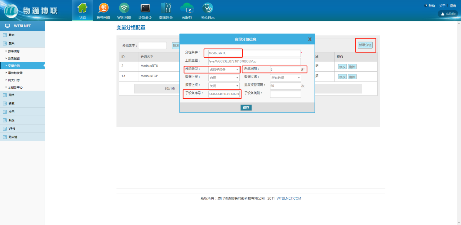 新增变量分组,分组类型选择虚拟子设备,网关端分组绑定变量后,采集周期优先级为分组设定的采集周期,网关“分组名字”对应华为云IOT“服务ID”,网关“子设备序号”对应华为云IOT子设备的“设备ID”。