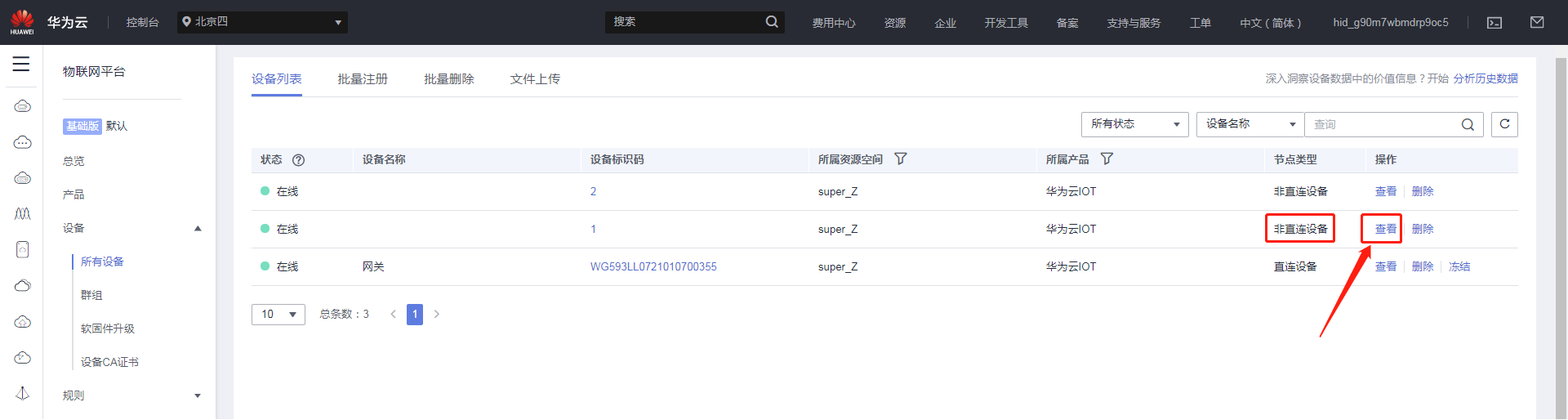 注册的设备为父设备,可以理解为网关,那么子设备可以理解为网关下接的设备;点击注册好的设备。