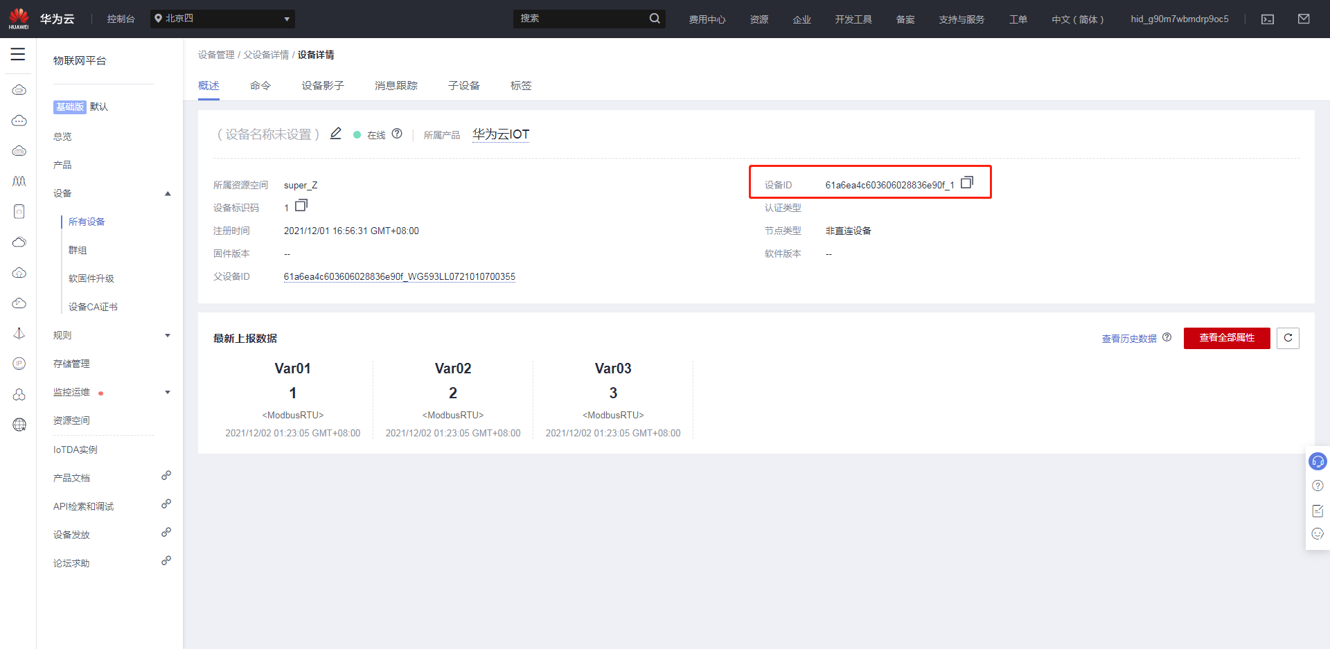 全部建立完毕后,在网关的数采配置界面,重启采集程序,即可看到华为云IOT上成功展示网关采集到的数据。