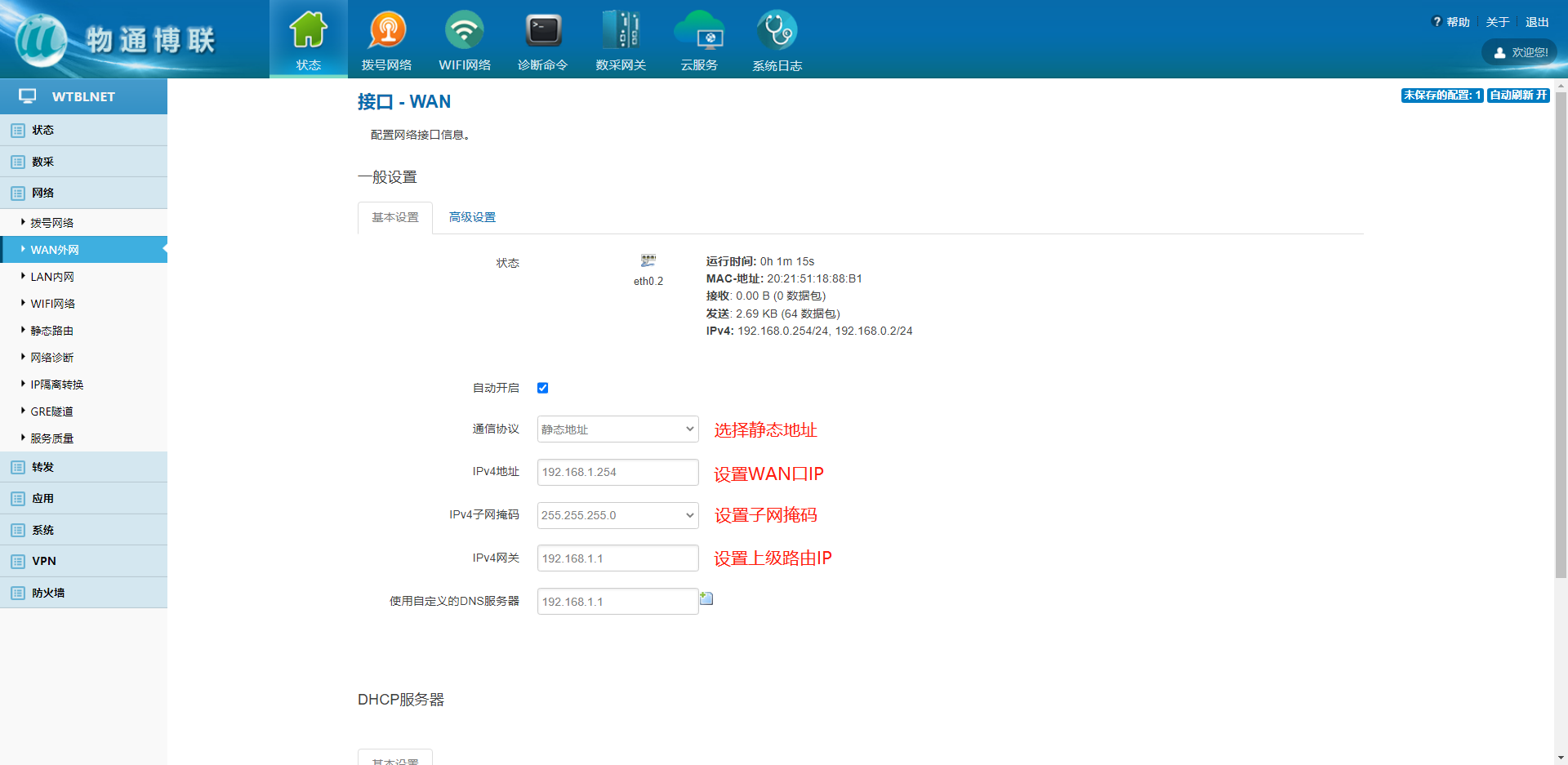 将网络隔离器设备上的LAN口与电脑端网口相连接(电脑与网络隔离器要同网段),并对网络进行配置,用户可以选择其中一种进行联网并且有且只能开启一种上网方式。