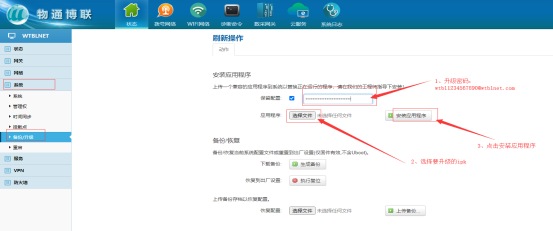 进入系统→备份升级,输入升级密码:wtbl1234567890@ybyttc.com ,然后选择对应要升级的ipk,最后点击安装,进度条显示100%即完成操作。