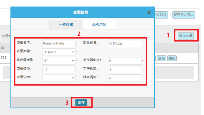 变量配置主要是定义变量名(自定义内容,不可使用中文命名)、变量别名(自定义,可使用中文名字)、寄存器类型和寄存器偏移地址,并定义一些数据规则(如:倍率、小数点、单位、告警)。