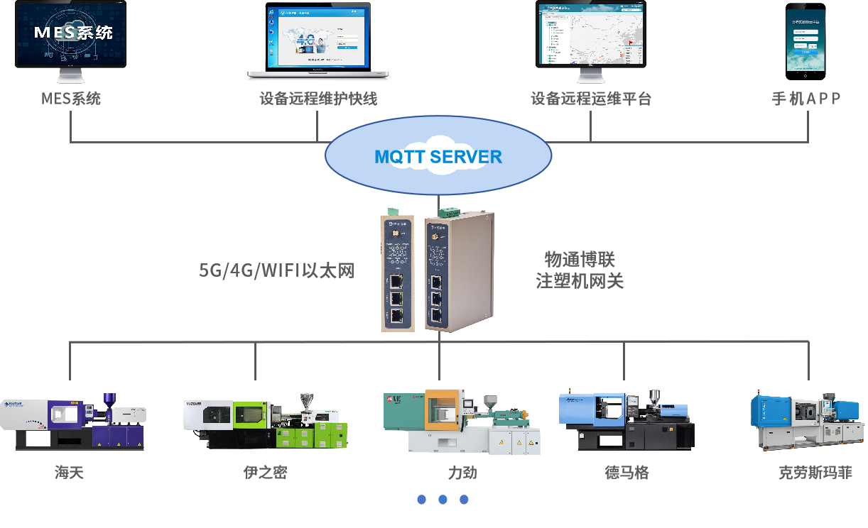 威九国际注塑机网关是一款针对注塑机实现数据采集的设备,主要用于解决注塑机等传统生产设备的数据采集、远程监控和信息化管理问题,网关支持各种注塑机的私有协议和其他工业标准协议(弘讯、科强、KEBA、恩格尔、住友、日精……),可以实现各种注塑机设备联网、数据采集,实时传输注塑机注射压力、油温、模具温度、注射速度等数据到本地服务器、云平台、MES、ERP等等,为制造业数字化转型给予了强大支持。