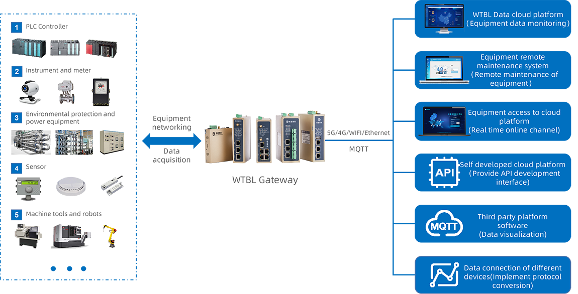 Supports access to remote software platforms through MQTT, MODBUS, OPCUA, SQL, and HTTP databases(Including: WTBL IOT cloud platform, cloud platform independently developed by customers, IOT cloud platforms such as RootCloud、Meiyun、Huawei、Alibaba、Baidu、Microsoft, configuration software, MES、ERP and other industrial software
