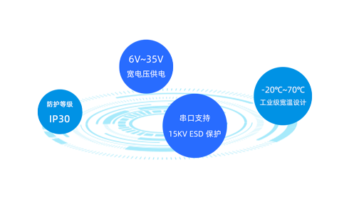 支持6V~35V宽电压供电,-20℃~70℃工业级宽温设计,适应更多对供电要求和温度要求的应用现场。具备有IO控制功能,使得远程控制轻松实现。 自带RS-232/RS-485串口无线数据终端通信功能,更符合工业客户需求。同时还具备如下特性: