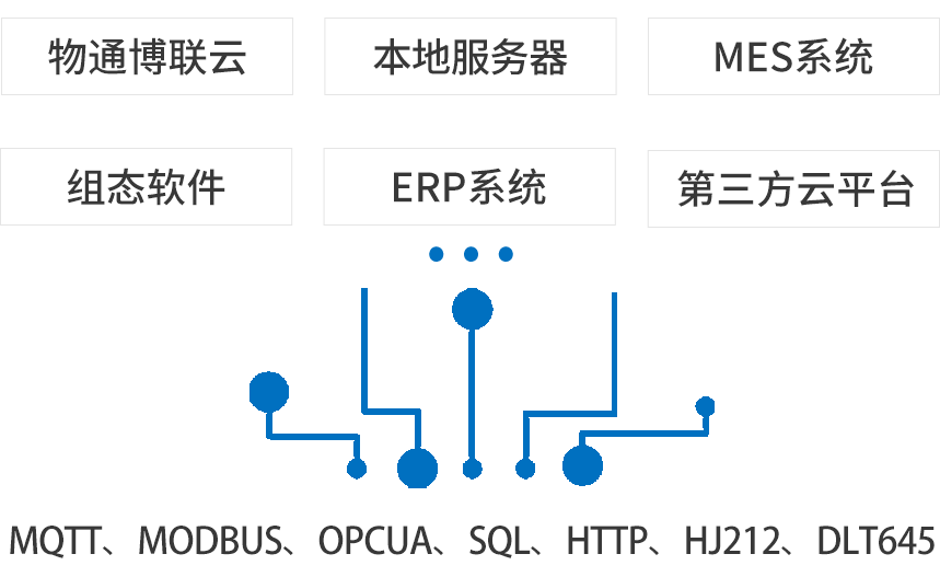 北向支持接入威九国际云平台,客户自主开发的云平台,第三方云平台(根云、美云、华为、阿里、百度、微软等IOT云平台),组态软件、MES系统、行业监控平台等工业软件