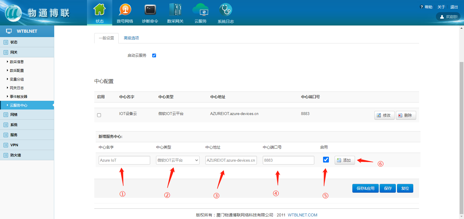 3、打开威九国际网关WEB界面,新建一个连接中心,中心类型选择微软IoT云平台,输入相应信息,勾选启用,点击“添加” ,填写对应数据即可实现设备数据上传到微软Azure IoT物联网平台。