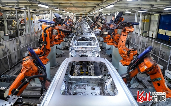 1月20日,长城汽车徐水分公司焊装车间,机器人在进行车身焊接组装。 河北日报记者 许佳奇摄