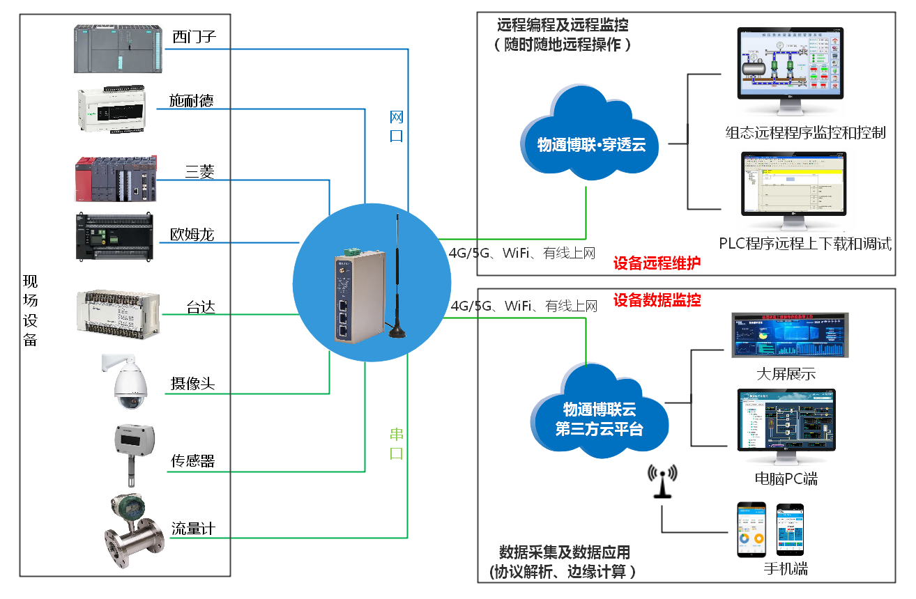 污水处理自动化系统普遍采用排污泵、PLC、水质检测传感器、电表等,需要把污水处理流程不同节点的物理数据信息顺利获得下位机转化为数据,并且顺利获得无线数据传输的形式上传至云端污水预处理智能化信息应用平台,实现污水处理现场各类下位机数据无线传输及远程维护管理。
