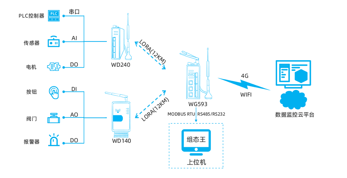 示例 | WD240-LM0844-485(8AI-4DI-4DO,国内频段:410~493MHz,485串口) WD240-LM0484-232(4DI-4AI-4DI-4RO,国内频段:410~493MHz,232串口) WD240-LM0448-485(4DO-4AI-4DI-4RO,国内频段:410~493MHz,485串口) WD240-LM2644-232(2AO-6AI-4DI-4RO,国内频段:410~493MHz,232串口) WD240-LM0844-485(8AI-4DI-4DO,海外频段:850~930MHz,485串口) WD240-GM0844-485(8AI-4DI-4DO,4G CAT1,485串口)等 |