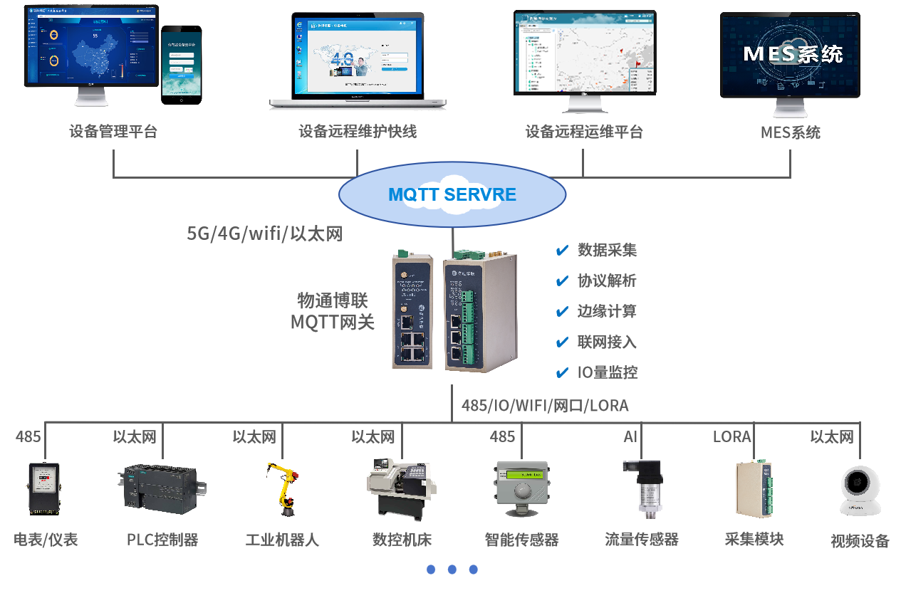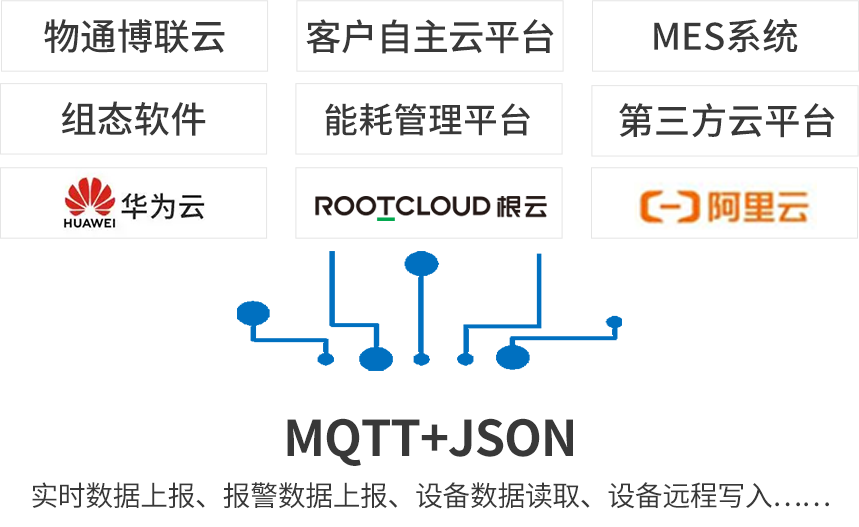 北向支持MQTT协议接入威九国际云平台,客户自主开发的云平台,第三方云平台(根云、美云、华为、阿里、百度、微软等IOT云平台),组态软件、MES系统、ERP系统等工业软件