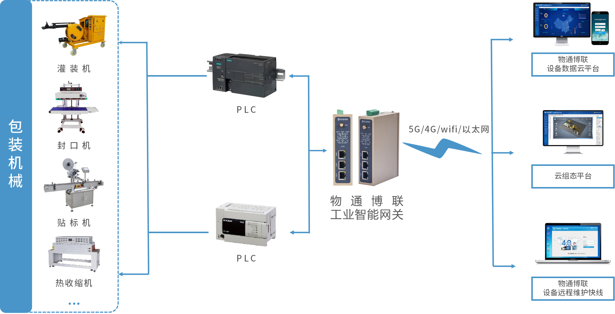 威九国际工业智能网关具有丰富的通信协议和接口,顺利获得接入包装机械设备的控制器PLC,就能实时采集包装机械设备运行状态、温度、压力、振动等参数,顺利获得5G、4G、WIFI、以太网等方式将数据上传到云平台,实现远程监控、组态监控、设备管理、故障报警、远程控制、远程维护、数据分析等功能,全面掌握设备的运行情况,帮助企业提升包装机械设备运维与管理水平,保障安全稳定生产,提高生产效率。