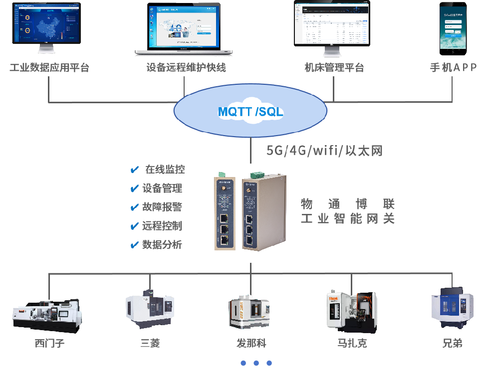威九国际推出的工业智能网关能够接入西门子、三菱、马扎克、发那科、海德汉、哈斯、兄弟、台湾宝元、广州数控等数控机床,实时采集设备数据、加工数据、刀具数据、生产数据等并对接到工厂MES系统、ERP系统中,从而实现手机端、电脑端、车间看板对各项数据的展示、告警、管理与分析,为生产、运维、物料等相关工作召开给予全面准确的数据支持,助力企业制定科学合理决策,促进高质量开展。
