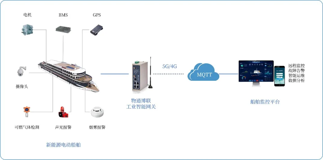 在全球 “双碳” 目标纵深推进与航运业绿色转型的浪潮下,新能源电动船舶已成为短途高频航运场景(货物运输、客渡交通、港口作业等)的核心选择。但《船舶应用电池动力规范》明确要求船舶需实时监测运行状态与电池参数、实现异常报警及标准化数据交换,而船舶移动分散、水面环境复杂、设备运维混乱等痛点,成为企业落地合规与高效运营的阻碍。