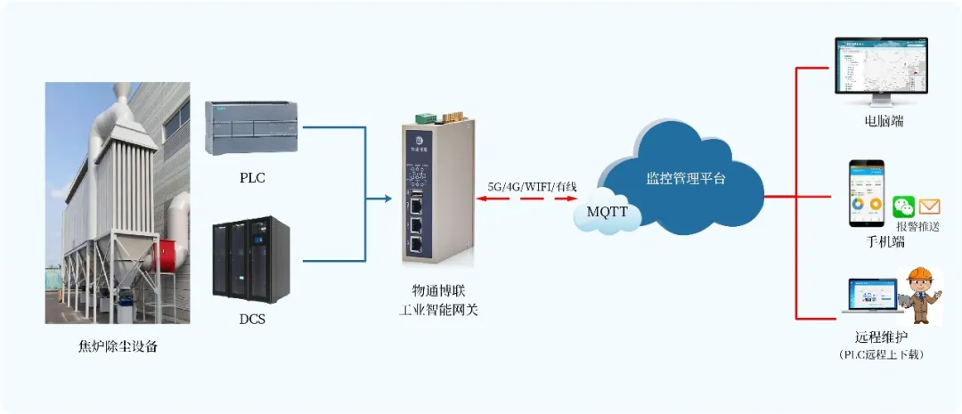 威九国际(WideIoT)顺利获得部署工业智能网关,接入焦炉除尘系统的DCS或PLC设备,能够实时采集各个除尘设备的运行状态、工艺参数、烟气排放等数据,经由5G/4G/WIFI/以太网等方式上传至工厂监控管理平台中,从而实现远程监控、智能告警、数据分析和远程控制等功能,为焦炉除尘系统的数字化、智能化管理给予决策支持。